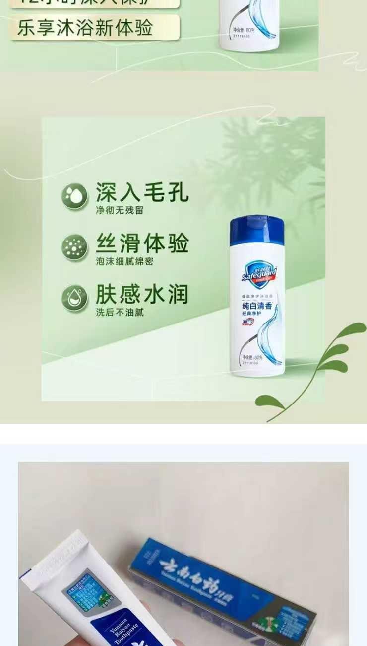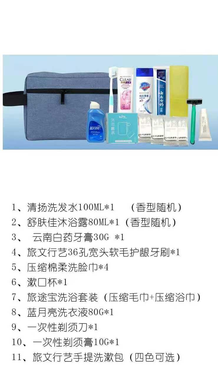 1、清扬洗发水100ml*1 (香型随机) 2、舒肤佳沐浴露80ml*1(香型随机) 3、 云南白药牙膏30g *1 4、旅文行艺36孔宽头软毛护龈牙刷*1 5、压缩棉柔洗脸巾*4 6、漱口杯*1 7、旅途宝洗浴套装(压缩毛巾+压缩浴巾) 8、蓝月亮洗衣液80g*1 9、一次性剃须刀*1 10、一次性剃须膏10g*1 11、旅文行艺手提洗漱包 这套洗漱套装涵盖了家庭及个人洗护用品,以简约实用为主旨。 包括清扬洗发水、舒肤佳沐浴露、云南白药牙膏等产品在内的洗护组合,满足了您的日常需求。旅文行艺36孔宽头软毛护龈牙刷,为您的口腔提供轻柔而深入的清洁服务;压缩棉柔洗脸巾和旅行宝洗浴套装分别解决了毛巾收纳和长途旅行中换洗的问题;蓝月亮洗衣液和一次性剃须刀则为您的衣物和面部提供了高效的洗涤和保养方法。这套套装旨在为您提供一套完整的洗护解决方案,让您的生活更加轻松愉快。
