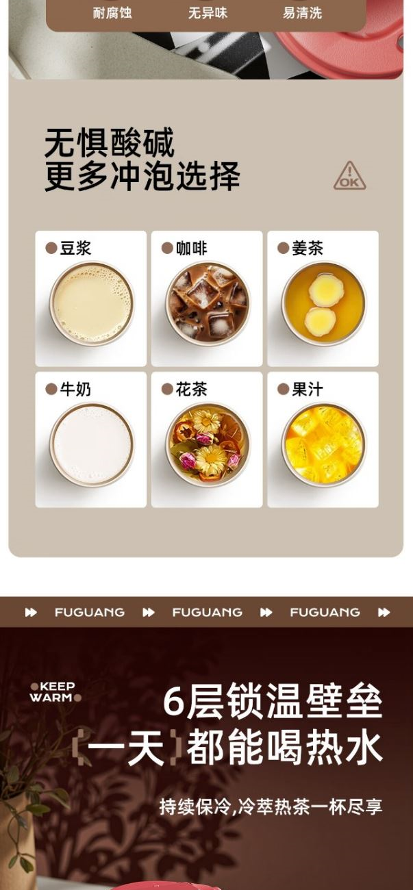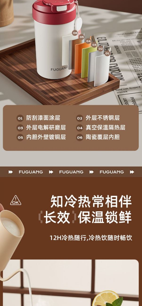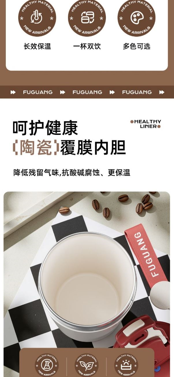 颜色分类:黑色 白色 红色 尺寸:85(顶部直径)*164mm 材质:双层陶瓷内胆涂层,内胆光滑细腻,易于清洗 经久耐用气孔极少吸水率低,能防止水分回发渗透以及 外界细菌的侵害。 304不锈钢外胆保护。陶瓷内胆设计泡茶,咖啡等不惧腐蚀,饮用更安心