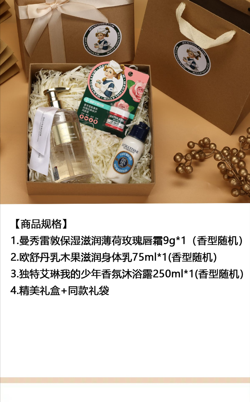 这套产品以高效护肤为特色,包括曼秀雷敦保湿滋润薄荷玫瑰唇霜、欧舒丹乳木果滋润身体乳及独特艾琳我的少年香氛沐浴露等优质护肤品。不仅具备保湿滋养功效,更散发出迷人的香气。精美的礼盒与礼袋使整个套装显得更为精致,是您馈赠亲友的理想选择。总之,这套产品力求满足您对高品质护肤的需求,让您在享受美丽的同时,感受到无与伦比的关爱与呵护