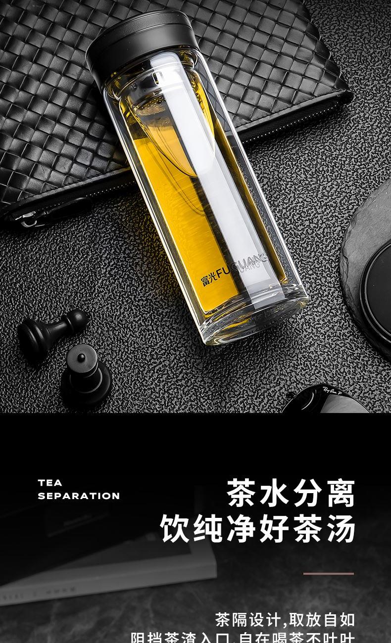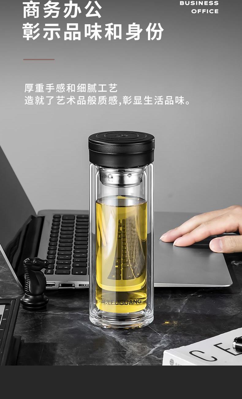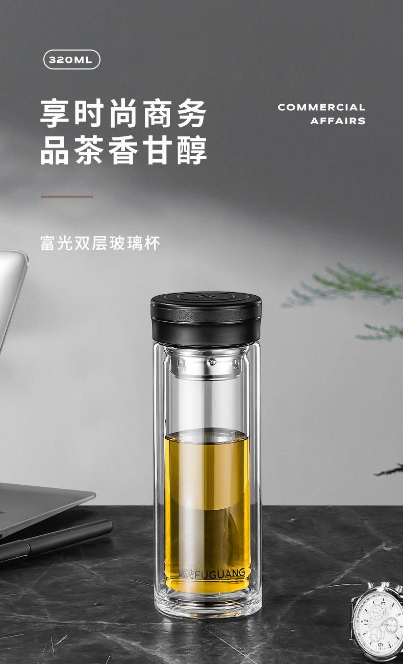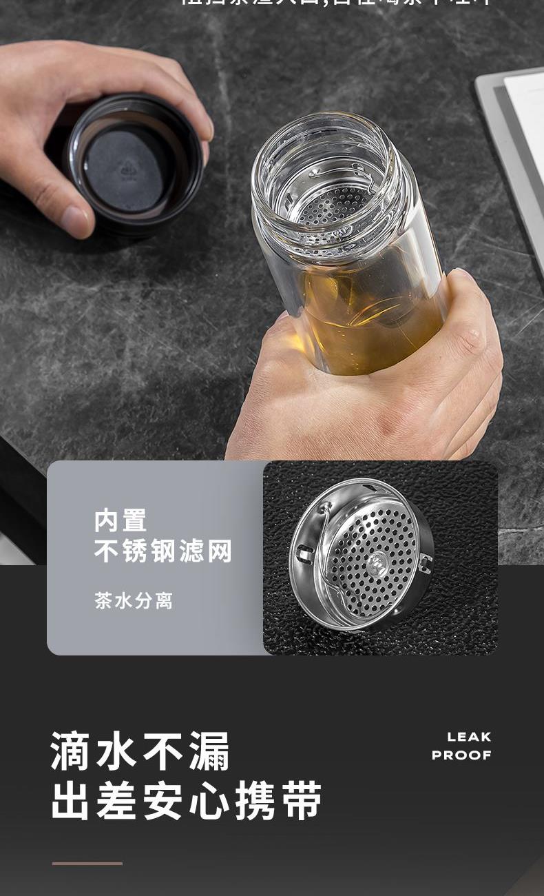 容量:320ml 颜色:黑色 尺寸:6.5*18.8cm 材质:双层高硼硅玻璃精雕细琢, 杯底加厚烧制,大气稳重,双层微真空隔热技术,有限阻隔温度传递,茶杯拿握不烫手。 304不锈钢滤网。PP商务杯盖,彰显尊贵身份。 包装:单瓦盒