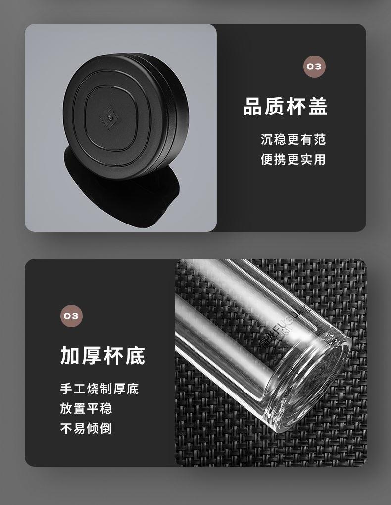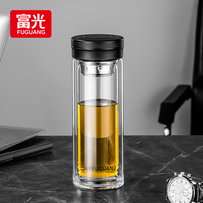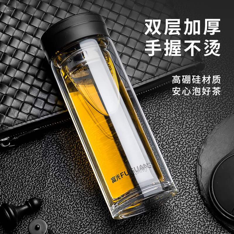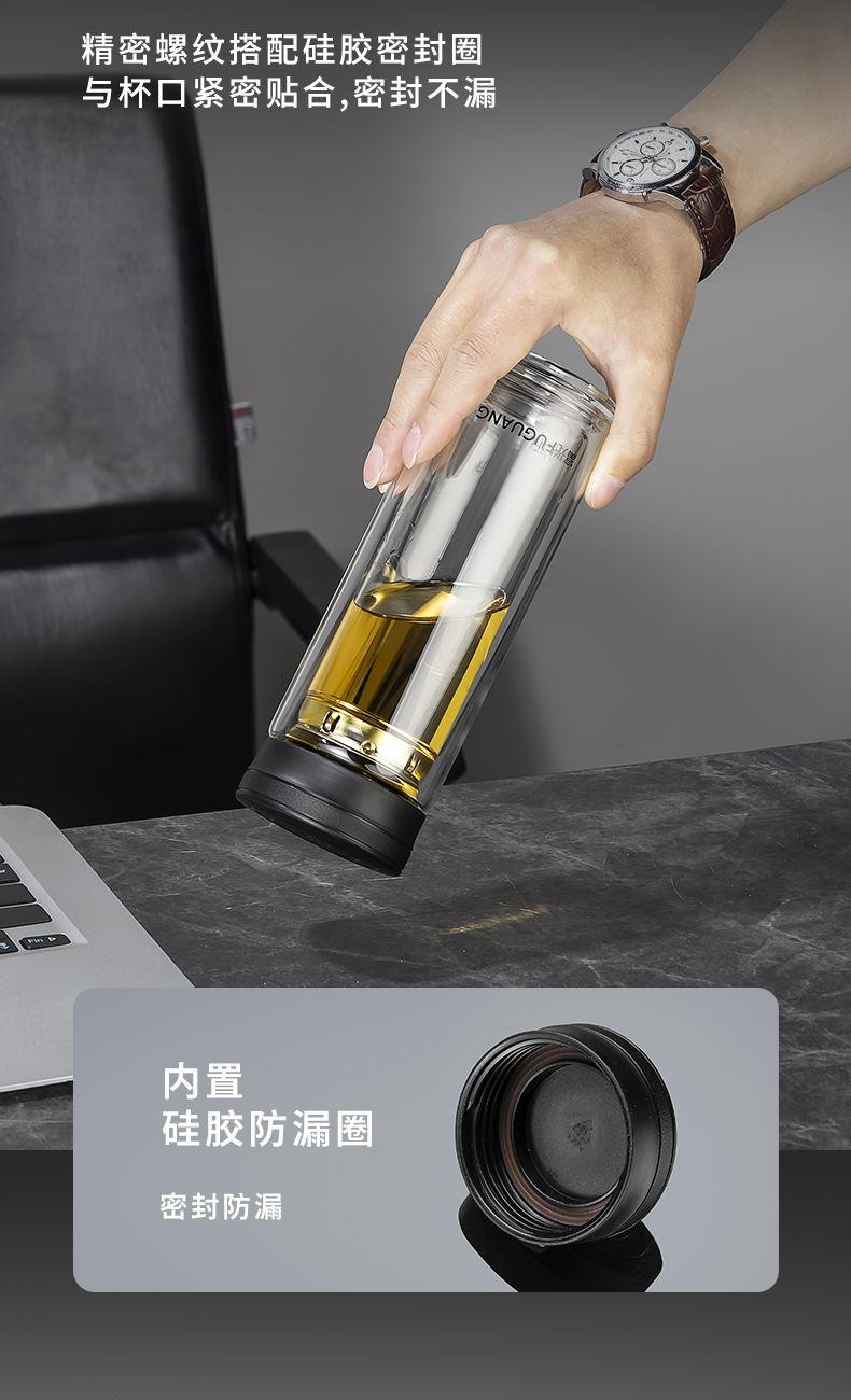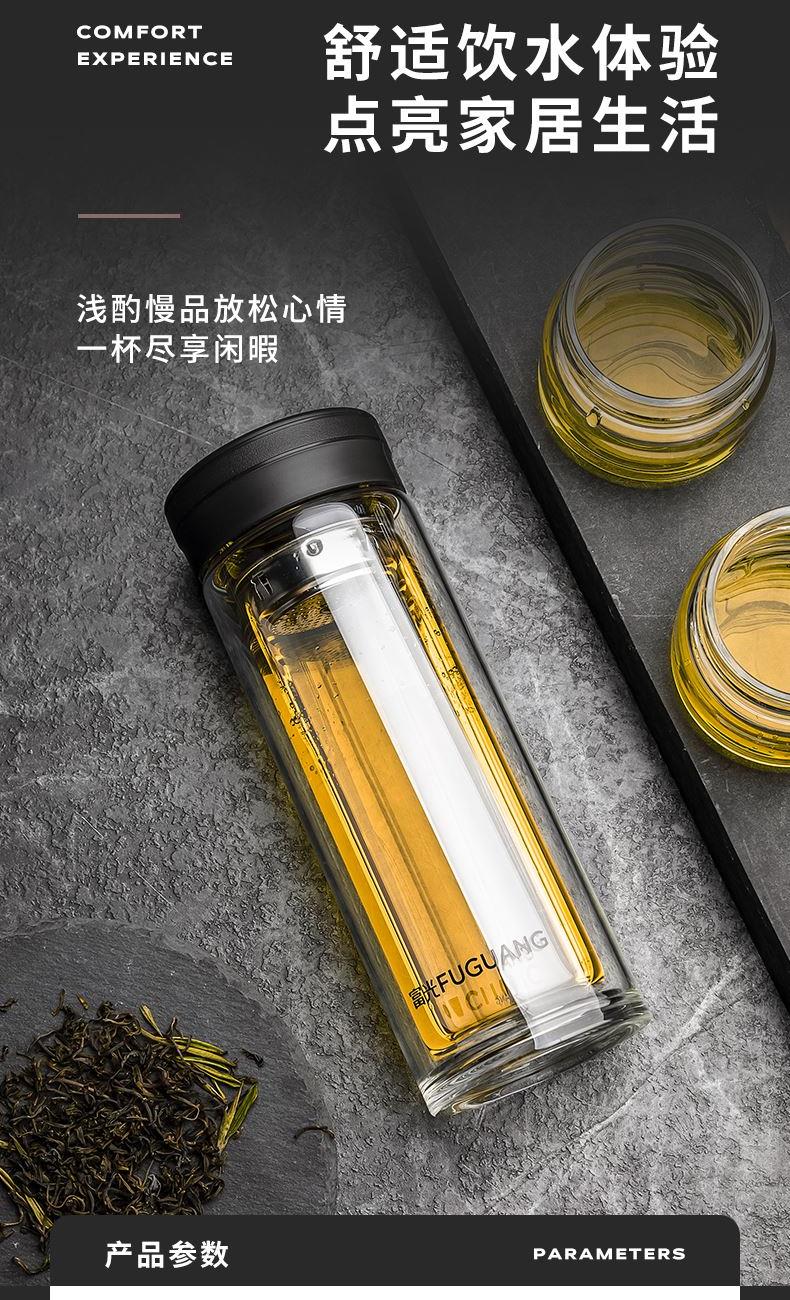 容量:320ml 颜色:黑色 尺寸:6.5*18.8cm 材质:双层高硼硅玻璃精雕细琢, 杯底加厚烧制,大气稳重,双层微真空隔热技术,有限阻隔温度传递,茶杯拿握不烫手。 304不锈钢滤网。PP商务杯盖,彰显尊贵身份。 包装:单瓦盒