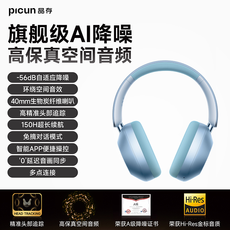 颜色:粉色、天蓝色、深空灰、银色、 连接模式:插音频线、蓝牙 蓝牙方案:JL7018 蓝牙版本:V5.4 电池容量:1200mAh 使用时间(70%音量):120小时, 开启降噪100小时 接受距离:10m 降噪深度:-35dB 频响范围:20HZ-20KHZ 喇叭尺寸:40mm 喇叭灵敏度:105±3dB(1khz) 充电接口:Type-c 1、支持【picun品存】APP智能互联控制 2、4麦阵列先进混馈降噪技术, 降噪深度达38DB 3、千元HIFI无损音质 大师级调教+自定义音效+空间音频 4、1200毫安大容量电池,zui高可支持120小时续航 5、支持头部追踪定位 6、全景声空间音频